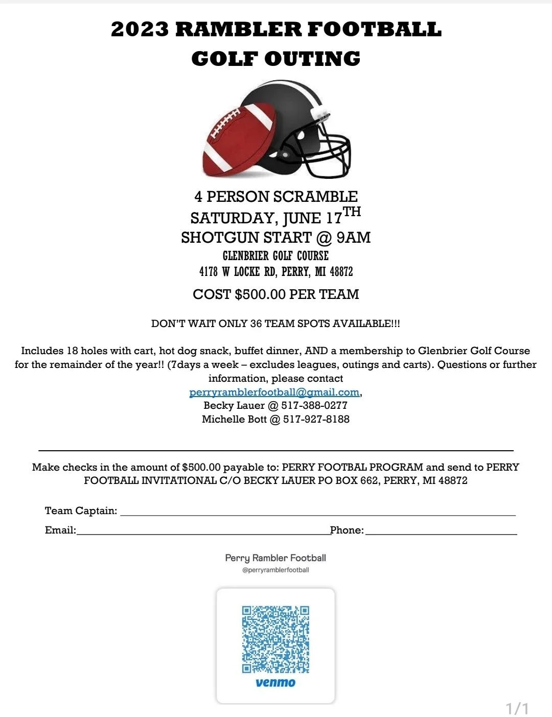 Back to All Events Rambler Football Outing Saturday, June 17, 2023 9:00 AM 2:00 PM Glenbrier Golf Course 4178 West Locke Road Perry, MI, 48872 United States (map) Google Calendar ICS