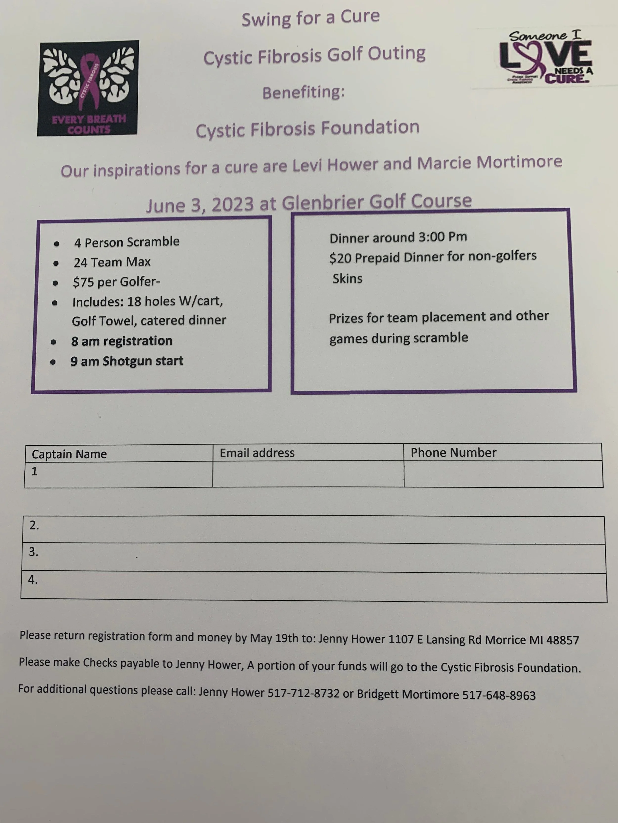 Swing for a Cure Cystic Fibrosis Golf Outing Saturday, June 3, 2023 8:00 AM 2:35 PM Glenbrier Golf Course 4178 West Locke Road Perry, MI, 48872 United States (map) Google Calendar ICS